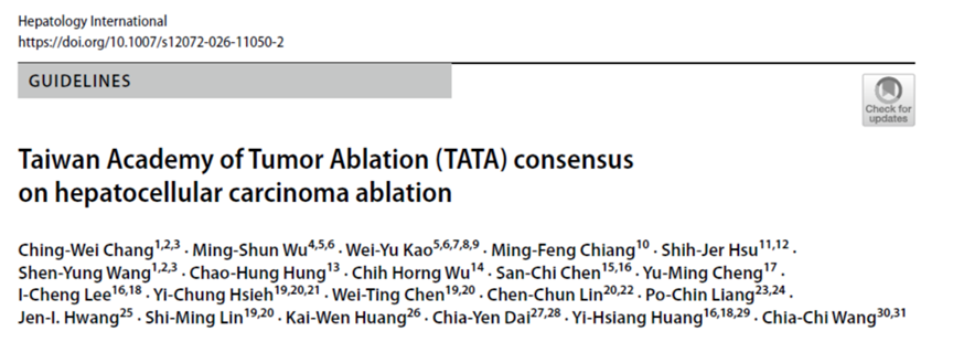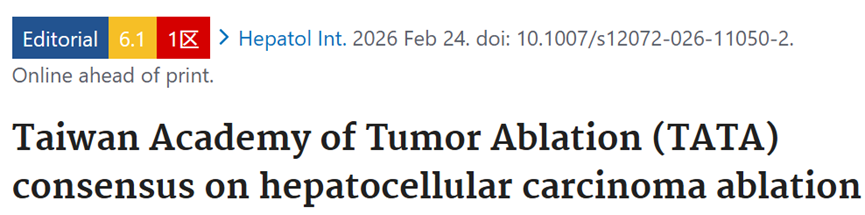 参考文献: Chang CW, Wu MS, Kao WY, Chiang MF, Hsu SJ, Wang SY, Hung CH, Wu CH, Chen SC, Cheng YM, Lee IC, Hsieh YC, Chen WT, Lin CC, Liang PC, Hwang JI, Lin SM, Huang KW, Dai CY, Huang YH, Wang CC. Taiwan Academy of Tumor Ablation (TATA) consensus on hepatocellular carcinoma ablation. Hepatol Int. 2026 Feb 24. doi: 10.1007/s12072-026-11050-2. Epub ahead of print. PMID: 41733829.