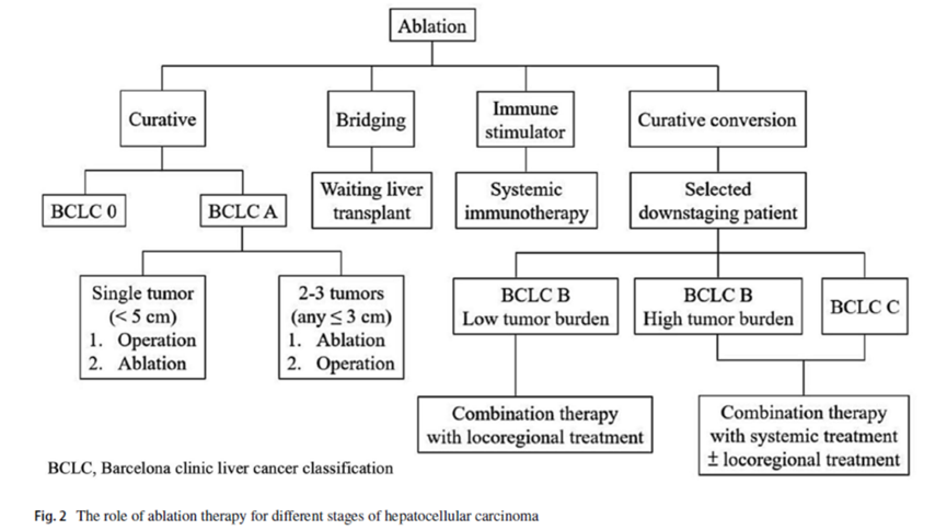 肿瘤消融是 HCC 的根治性治疗选择,具有微创、恢复快和保留肝功能的优势。消融可与其他局部或全身治疗联合,可能促进肿瘤降期并通过肿瘤坏死后抗原释放增强免疫治疗疗效。本指南提供循证建议,涵盖不同 HCC 分期的适应证 ( 图 2) 、患者和肿瘤相关因素、消融设备和技术进展、治疗结局、风险和随访策略。此外,随着医疗技术的快速发展——特别是人工智能和机器人技术——未来预期将出现更精准、更高效的消融手术。