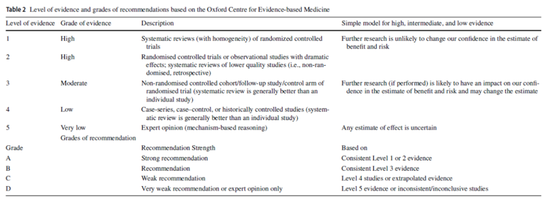 德尔菲法首先涉及确定主题和选择专家小组。第一轮发放 18 份问卷,回收 15 份。这些主要是开放式问卷,允许专家提出 3-5 条声明。整理回复后,形成 28 条初步声明。第一轮未回复者被排除在后续分析之外。第二轮发放 16 份问卷,全部回收 (100% 回复率 ) 。专家审查内容、证据等级和推荐强度,提供修订建议和重要性评级。结果汇总后反馈给专家组。第三轮再次发放 16 份问卷,回收 16 份,完成最终投票。采用五级同意量表: A , " 强烈同意 " ; B , " 同意 " ; C , " 中立 " ; D , " 不同意 " ; E , " 强烈不同意 " 。建议获得≥ 75% 专家同意 (" 强烈同意 " 或 " 同意 ") 方可通过。两条获得≥ 60% 同意的观点性声明也被纳入。每条建议均考虑证据的强度和一致性以及专家组的临床经验。采用牛津循证医学中心 (OCEBM) 框架对证据和推荐强度进行分级。