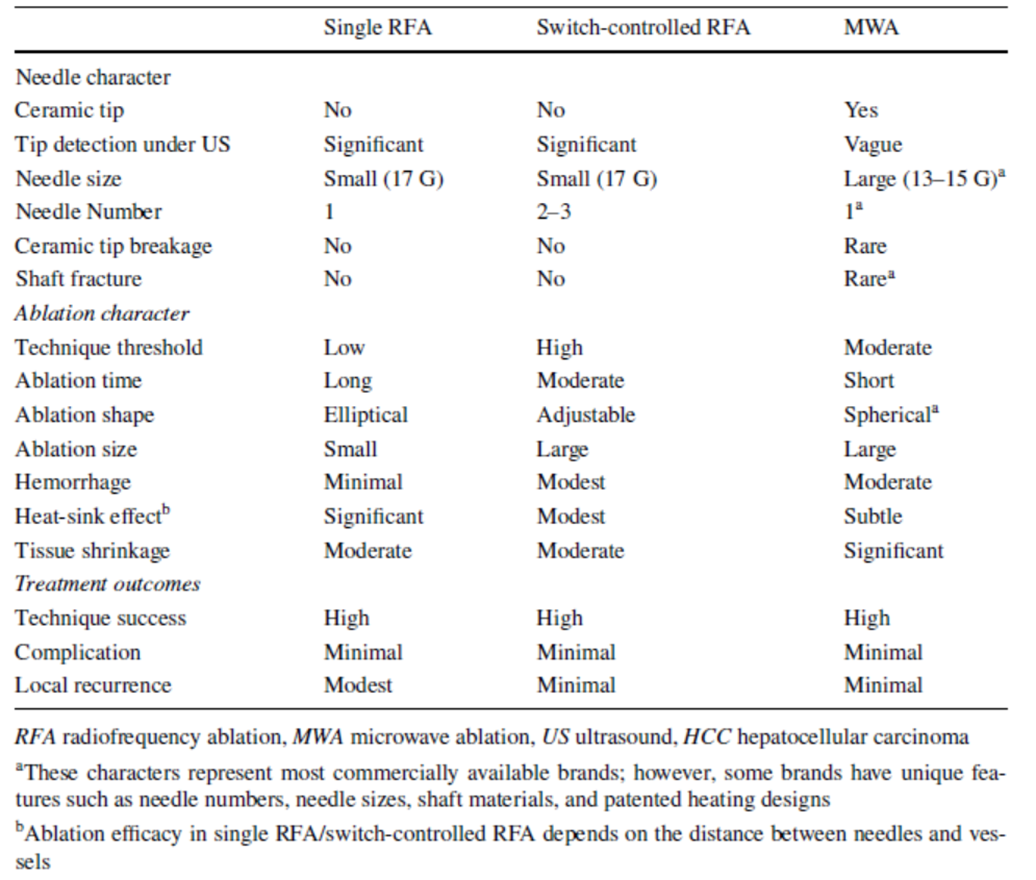 RFA 和 MWA 是早期 HCC 的两种主要局部区域治疗。在一项随机对照研究中, Sugimoto 等比较了 MWA 与单电极 RFA 治疗 <4.0cm 肿瘤。 OS 和 RFS 相当,但 MWA 显示出更优的局部肿瘤控制。主要机制差异在于热量产生: RFA 通过电极周围电阻加热然后向外热扩散诱导热损伤,而 MWA 产生电磁场在消融区内均匀加热组织,产生更一致、组织依赖性更低的热分布。 MWA 允许更高的能量输送,实现更快加热和更短消融时间。另外两项随机对照研究证明了手术效率差异。 Vogl 等报告 MWA 在更短时间内达到比 RFA 更大的消融体积 (66.5cm ³ vs. 29.2cm ³; 11.2 vs. 16.3 分钟 ) 。 Kamal 等同样发现 MWA 比 RFA 更快达到目标消融终点 (4.41 vs. 14.21 分钟, P<0.001) 。采用高功率 MWA 系统,现在可在 10 分钟内消融达 4.1cm 的肿瘤,降低麻醉风险并提高手术效率。