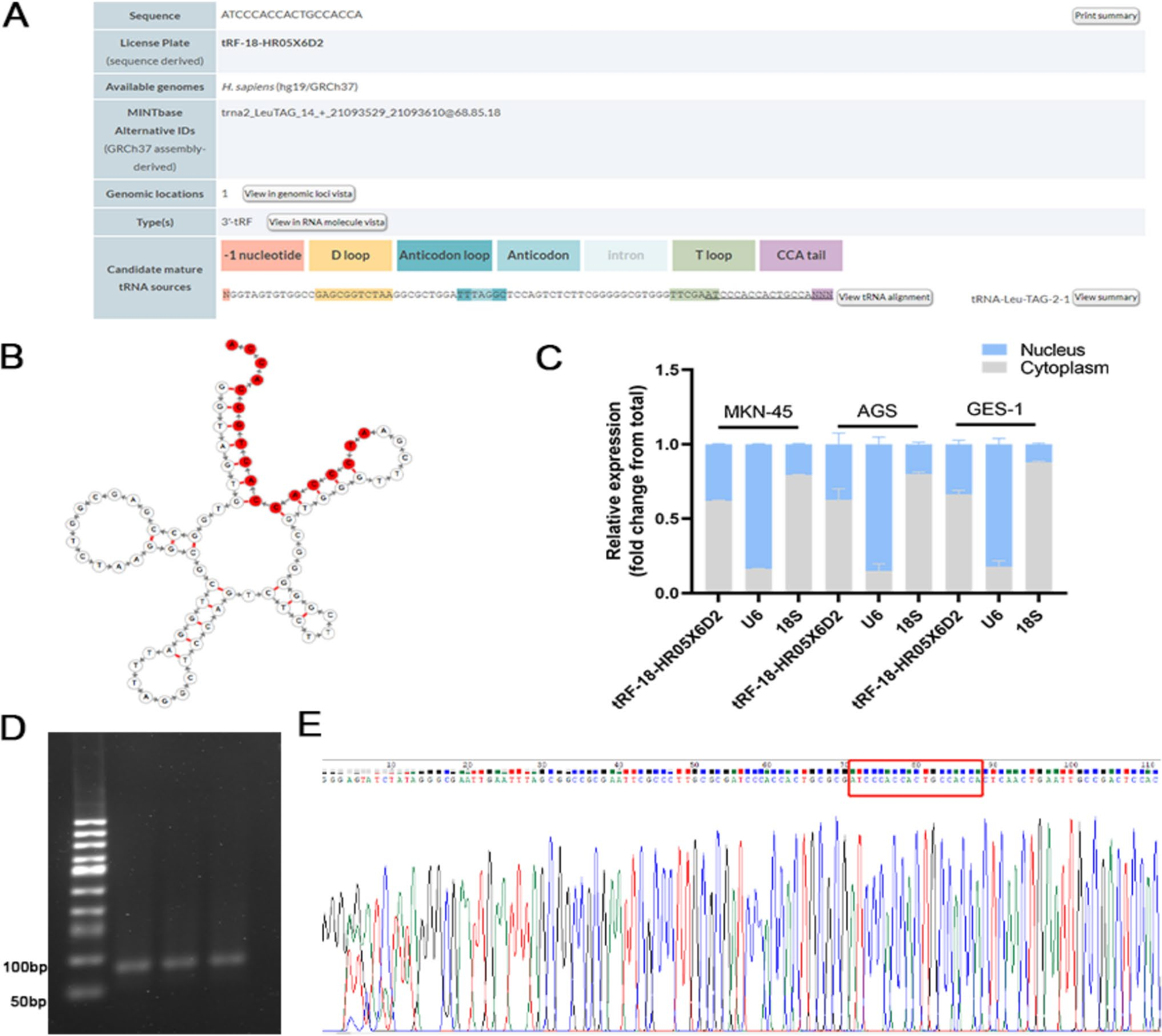 随后,研究通过qRT-PCR对5个候选tsRNAs进行了验证,结果表明mt-tRF3-21-PheGAA、tRF3a-AlaTGC-5、tRF5-20-ValCAC-6和tRF3a-LeuTAG-2在GC患者血清中的表达水平均显著高于健康捐献者。其中,tRF3a-LeuTAG-2(即tRF-18-HR05X6D2)在GC组织和多数GC细胞系中也表现出显著升高的表达,并且其在血清和组织中的表达水平呈正相关。最终,tRF-18-HR05X6D2 被选定用于后续的深入研究。
