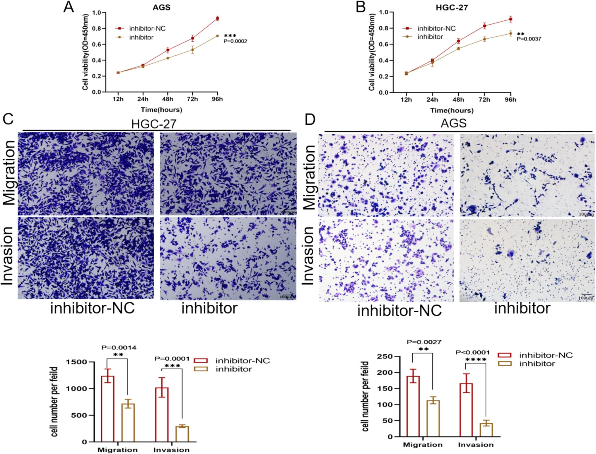 功能研究:通过CCK-8实验评估tRF-18-HR05X6D2抑制剂对GC细胞增殖的影响。通过Transwell实验检测其抑制剂对GC细胞迁移和侵袭能力的影响。