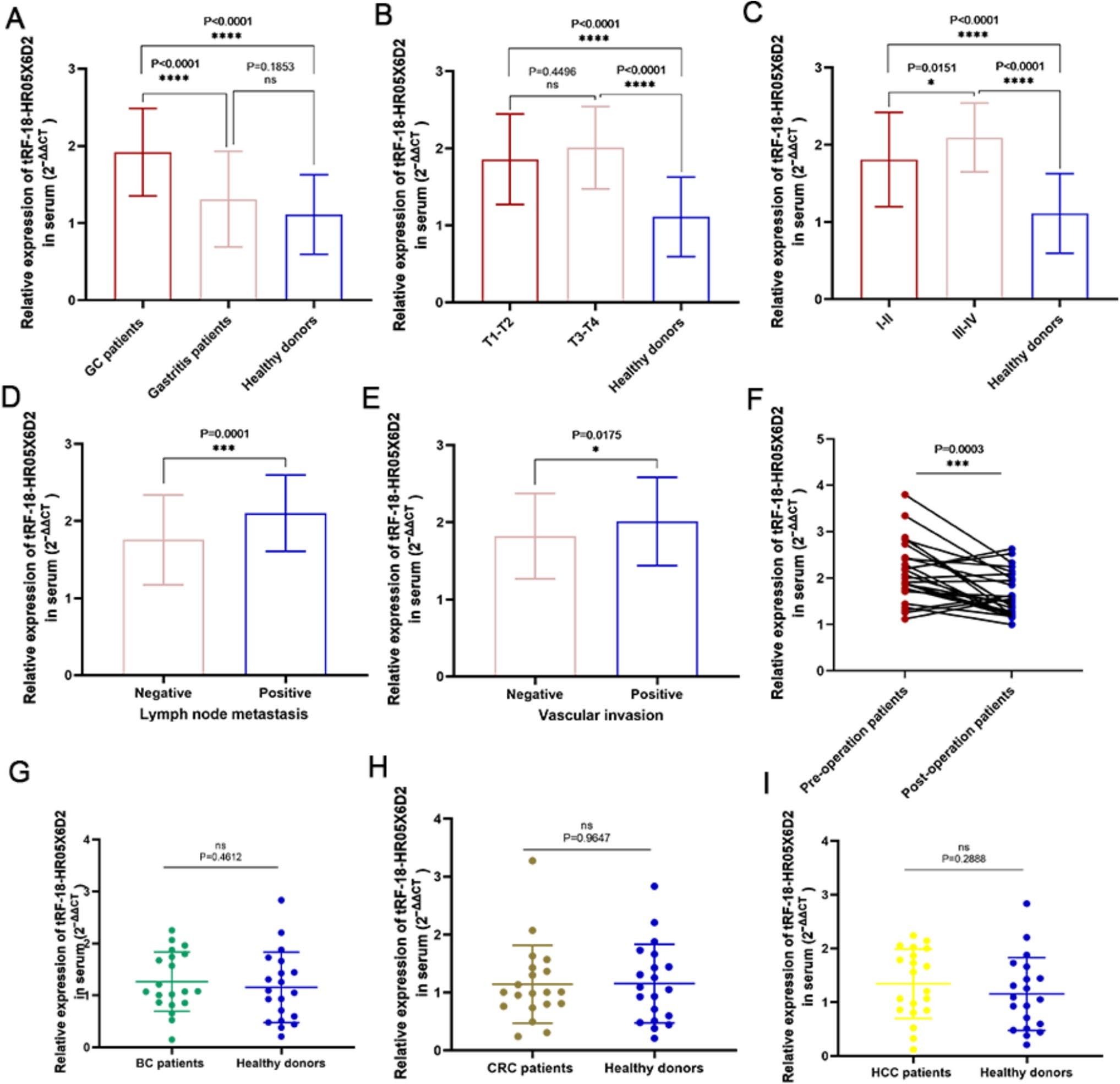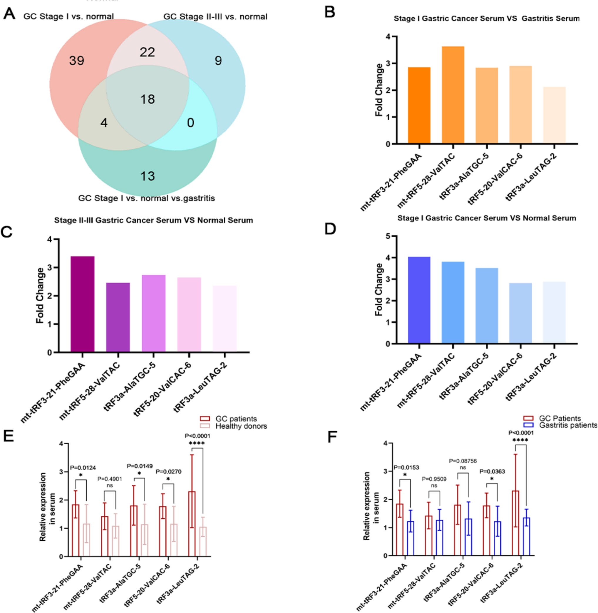 研究首先对来自GC患者、胃炎患者和健康捐献者的20例血清样本进行了tsRNA微阵列分析。结果显示,与健康对照组相比,I期GC患者血清中有83个tsRNAs显著上调;II–III期GC患者血清中有49个tsRNAs显著上调。将这些结果与胃炎患者血清中的上调tsRNAs进行交叉比对,最终确定了18个在三组比较中均显著上调的tsRNAs。