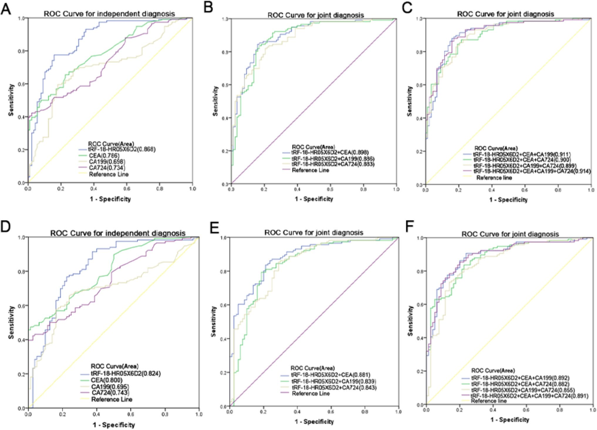 区分GC与胃炎患者:tRF-18-HR05X6D2单独诊断的AUC为0.824,仍高于CEA(0.800)、CA19-9(0.695)和CA72-4(0.743)。四项标志物联合检测的AUC达到0.891。