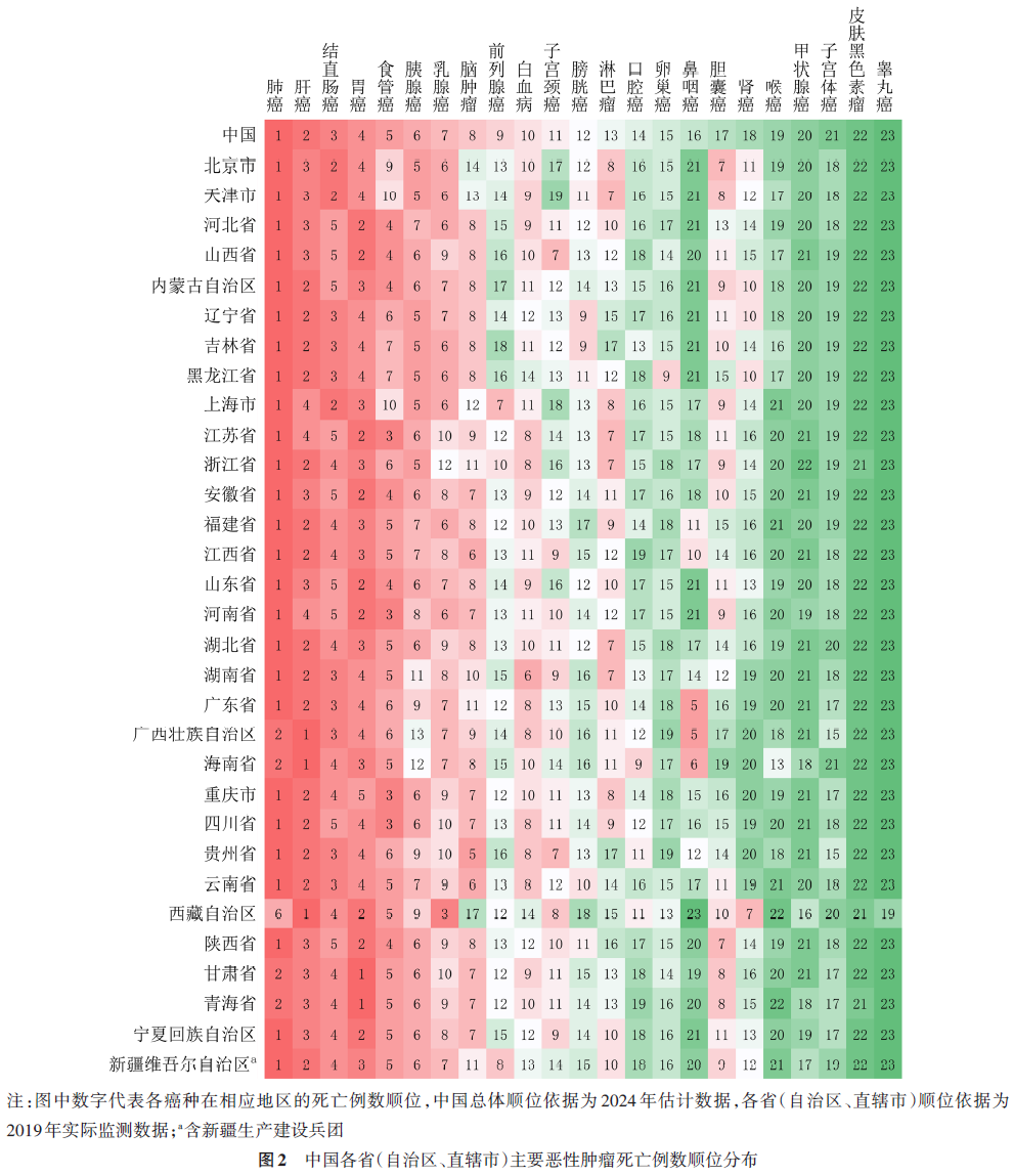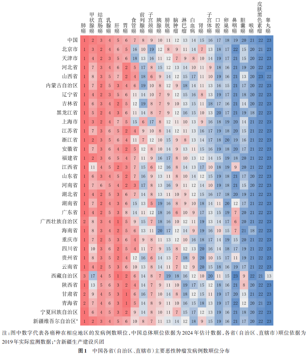 中国31个省(自治区、直辖市)主要恶性肿瘤的发病和死亡例数顺位