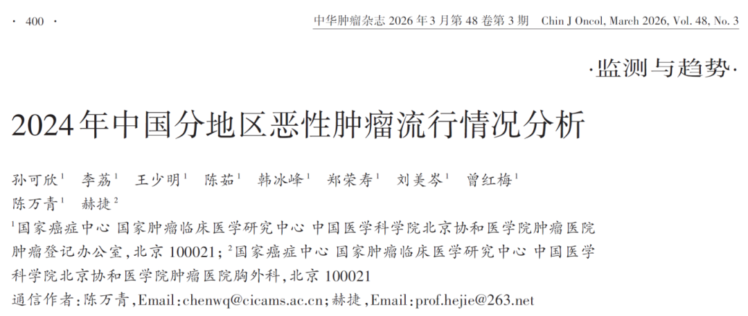 孙可欣, 李荔, 王少明, 等. 2024年中国分地区恶性肿瘤流行情况分析[J]. 中华肿瘤杂志, 2026, 48(3):400-412. DOI:10.3760/cma.j.cn112152-20260205-00079.