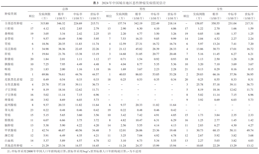 新发病例 315.80 万 ,中标发病率 224.69 /10万 , 世标发病率 215.71/10万