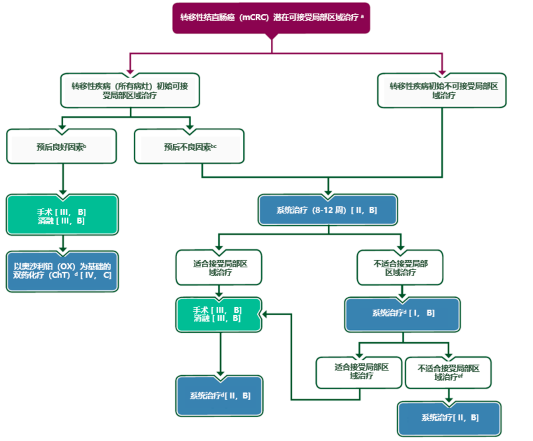 a:所有寡转移(OMD)患者的治疗方案均应在多学科团队(MDT)中讨论决定[证据等级IV,推荐等级A];b:需考虑的因素包括:受累器官数目、病灶数量、预后评分、出现转移的时间、BRAF状态、MMR状态、CEA水平、淋巴结病理情况[IV,B];对于可切除的BRAF V600E突变及/或dMMR型转移性结直肠癌(mCRC)患者,尽管通常推荐先行全身治疗,局部区域治疗仍可作为一种选择[IV,B];c:若存在多项不良预后因素,可推荐采用现有最佳的全身治疗方案,包括化疗(ChT)联合靶向治疗[III,B];d:术前及术后全身治疗的总疗程通常应为6个月[II,B];e:对于经严格筛选、仅肝转移且始终不可切除的结直肠癌肝转移(CRLM)患者,若满足严格入选标准(BRAF野生型、CEA<80ng/ml、对全身治疗持续有效(病情稳定≥3个月且不晚于三线治疗)、全程无肝外转移、原发灶已切除、ECOG PS<2、年龄18~65岁)并符合器官分配政策,推荐行肝移植联合化疗作为根治性治疗选择[II,A];f:针对特定转移部位的推荐意见详见正文