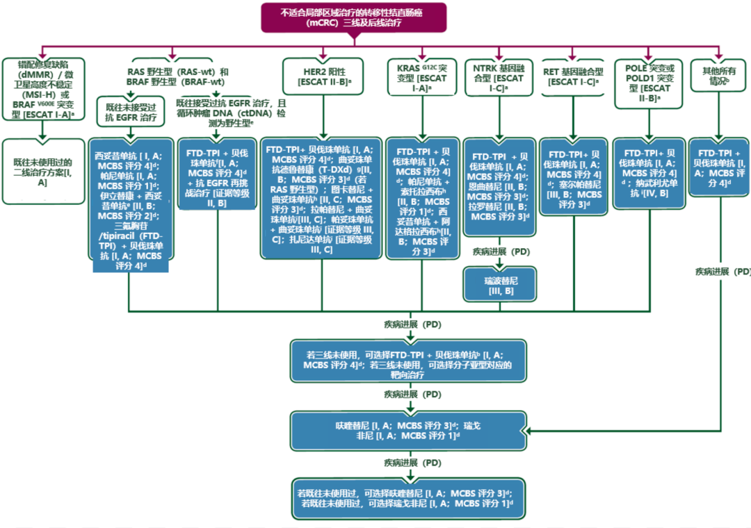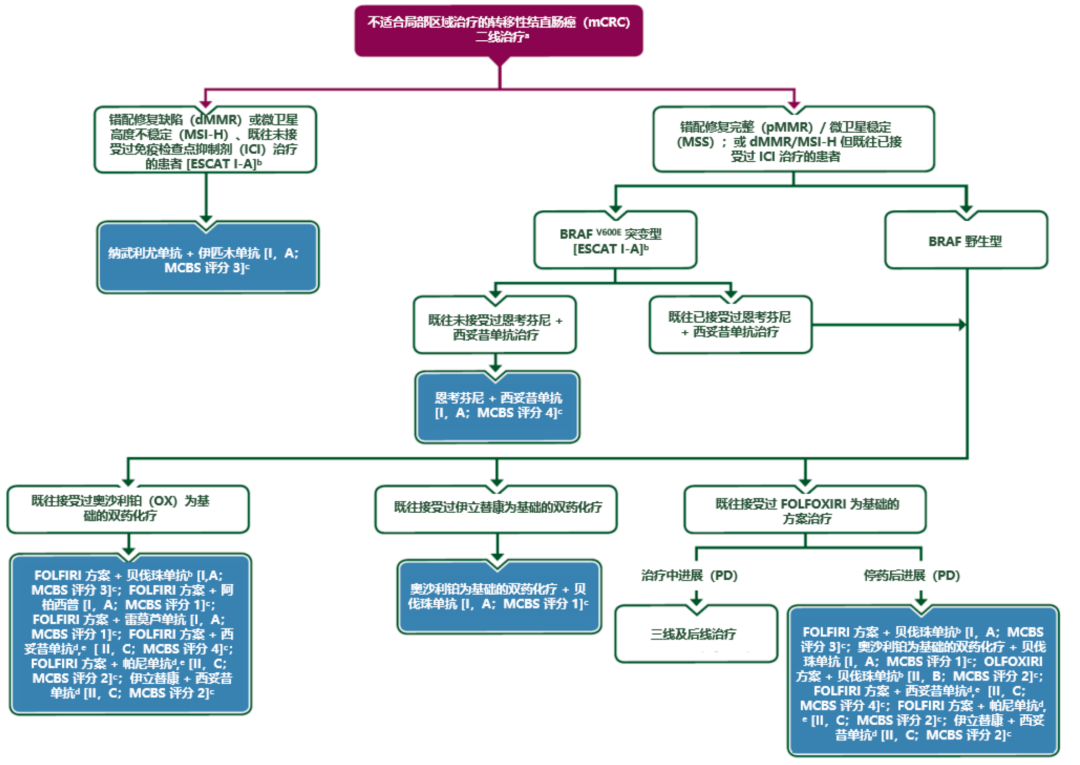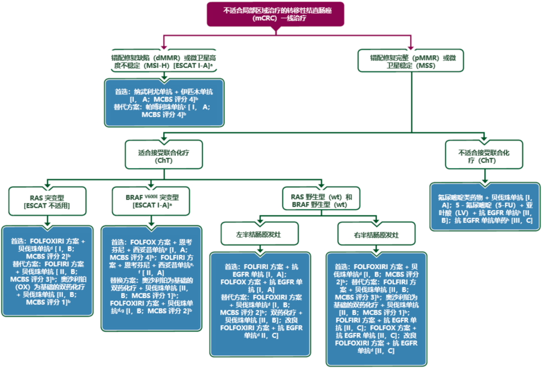 a:ESCAT评分仅适用于基因组驱动分析中发现的基因改变,这些评分由作者定义,必要时由ESMO精准肿瘤学工作组提供协助;b:采用ESMO-MCBS v2.0计算EMA或FDA获批的治疗方案/适应症的评分,评分由ESMO-MCBS工作组计算并验证,并经作者审核(https://www.esmo.org/guidelines/esmo-mcbs/esmo-mcbs-evaluation-forms);c:当无法使用免疫检查点抑制剂(ICI)双药联合治疗时;d:FOLFOXIRI方案仅推荐用于:年龄<70岁且ECOG PS 0~2分,或年龄71~75岁且ECOG PS 0分的患者[证据等级I,推荐等级B];e:已获FDA批准,未获EMA 批准;f:尤其适用于既往接受过奥沙利铂类辅助化疗,或存在奥沙利铂禁忌证的患者;g:适用于原发灶位于右半结肠的患者;h:适用于RAS野生型、BRAF野生型且原发灶位于左半结肠的患者