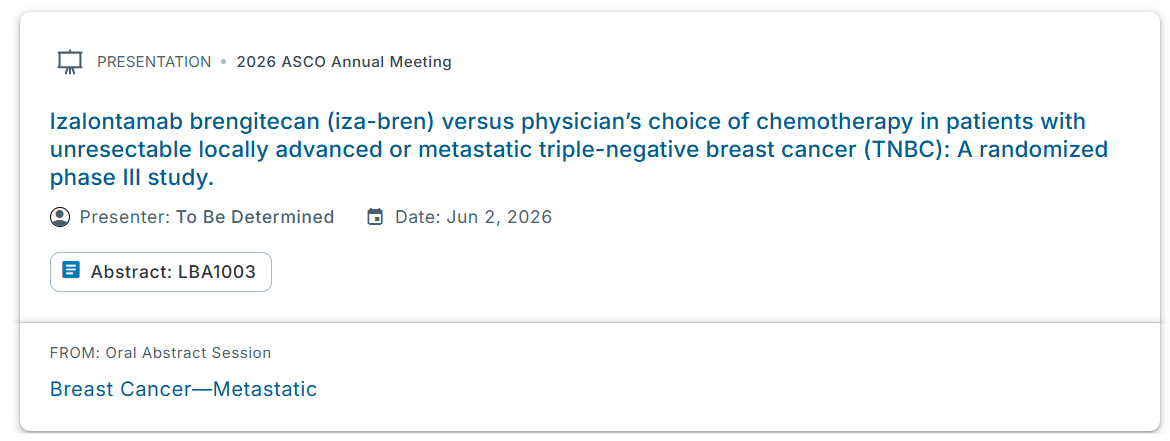 在医药创新的前沿浪潮中,“天生爆品”从来不是一句简单的宣传语,而是科学逻辑、研发速度与临床价值交织出的必然结果。在即将到来的2026 年ASCO年会上,全球首创的EGFR×HER3双抗ADC—iza-bren,将重磅披露两项Ⅲ期研究数据:三阴性乳腺癌(BL-B01D1-307)、食管鳞癌(BL-B01D1-305),再次刷新iza-bren循证高度。