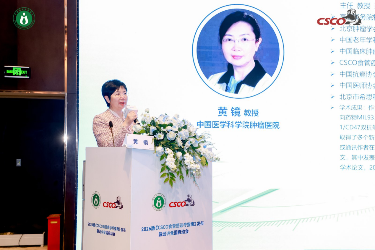 在全场专家学者的共同见证下,CSCO食管癌专委会李印教授、黄镜教授、傅剑华教授、曹国春教授、赵快乐教授、马建群教授、王峰教授、何义富教授、秦建军教授以及彭湃先生共同参与了隆重的2026版《CSCO食管癌诊疗指南》巡讲全国启动仪式。