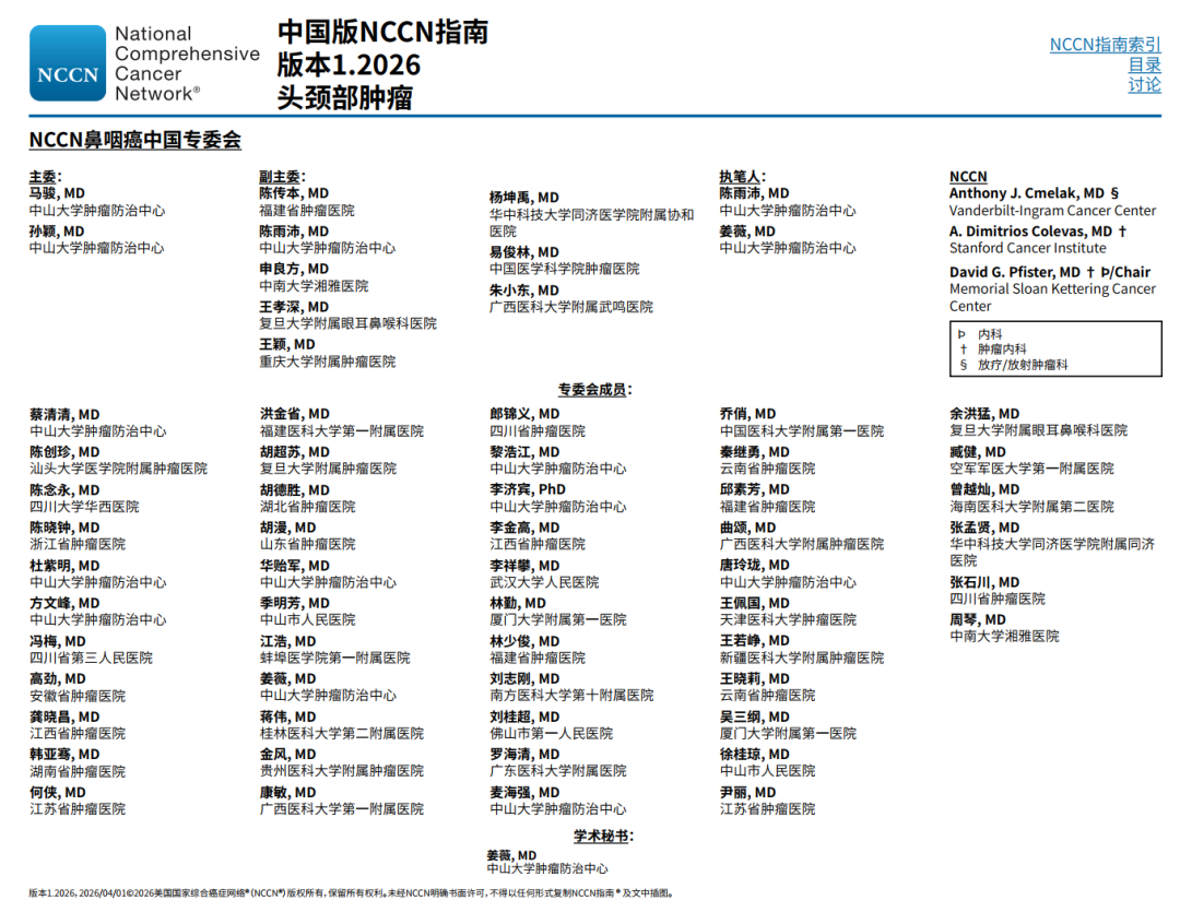 2026年4月26日,由中山大学肿瘤防治中心马骏院士、孙颖教授领衔,联合全国七大区域50余位顶尖专家所组建的美国国家综合癌症网络(NCCN)鼻咽癌中国专委会,正式发布《美国NCCN鼻咽癌指南中国版(2026)》(以下简称《指南》,。NCCN首席执行官Crystal Denlinger教授,头颈肿瘤指南主席、纪念斯隆-凯特琳癌症中心DavidG. Pfister教授等国际权威专家,与国内近百位专家共同见证这一里程碑时刻。