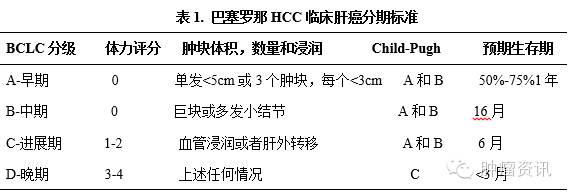 国际公认的PLC(原发性肝癌)治疗原则是根据循证医学证据做的总结,内容包括:根据BCLC(巴塞罗那临床肝癌)评分原则,将患者按照不同的预后分为5类,并针对每一类患者做了详尽的治疗规范。对于早早期肝癌患者(BCLC 0级和A级),可以接受肝肿瘤切除、常规肝移植以及经皮肝脏局部射频消融术治疗,从而达到根治的效果。但是,这部分患者的疗效主要取决于肿块的体积、肝脏疾病状态、合并的并发症以及年龄等综合因素。尽管对于符合适应症的患者接受上述根治性治疗后可将5年生存率提高到50%-75%,但是,与肝脏移植术治疗相比,肿瘤切除和射频消融治疗的患者往往出现更高的肿瘤复发率(复发率分别为70% vs. 10%);门脉高压一定程度上可以降低肿瘤复发的发病率和死亡率。一般来讲,处于肝癌中期BCLC B的这部分肝癌患者,他们并不适合接受根治性治疗方案,如果他们处于肝硬化代偿期,并可以接受反复的TACE(肝动脉化疗栓塞术)治疗,总生存期大约16-20个月。对于一般状况差或者对TACE治疗无效的进展期肝癌患者(BCLC C),他们接受口服多激酶抑制剂索拉非尼治疗后,生存期可能延长。然而,由于大多数指南推荐的治疗策略均来自非实验设计的研究以及专家意见,而不是来自经过精心设计以及严格的随机对照临床研究结果,因此,它们并不适合所有肝癌患者的治疗方案的选择。事实上,超过1/3的早期肝癌患者并不适合接受根治性治疗,因为他们年龄偏大、合并严重的并发症和肿块的特殊部位,使得他们不得不接受姑息治疗。接受肝肿瘤切术手术如果5年生存率超过50%,那么患者及家属可能认为给予伴有中度门脉高压的BCLC A患者以及部分BCLC B患者手术切除治疗是不错的治疗选择。(BCLC分期标准见表1)