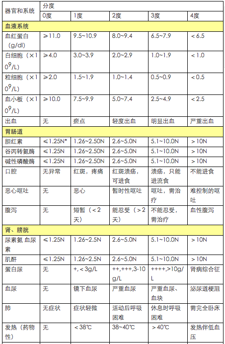 2、血小板抑制:血小板的下降比白细胞晚,但是回升非常快;目前没有非常的好的药物治疗血小板下降;I度和II度的血小板的抑制无需处理;III度和IV度的血小板抑制需要积极地处理;