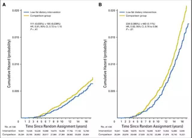 在女性健康协会(Women’s Health Initiative)的膳食调整试验中,研究人员从1993年开始将女性参与者随机分组(年龄范围,50~70岁),分别接受常规饮食或减少脂肪、增加蔬菜水果谷物的饮食。中位数8.5年时的结果表明,参与膳食调整的这部分女性中乳腺癌的死亡率较低。此份报告将随访时间延长至中位数16年,重点关注膳食调整对乳腺癌患者总死亡率和乳腺癌死亡率的影响。