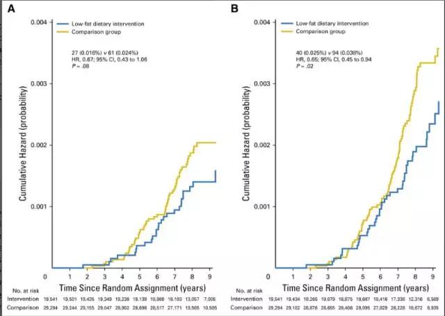 虽然两组大多数乳腺癌特征相似,但在膳食调整组中,雌激素受体阳性、孕激素受体阴性这一不良预后类型的患者比例显著较低。在延长随访期间,在有首发乳腺癌的3030名参与者中,死于乳腺癌的人数在膳食调整组中略少(但无显著差异)。然而,膳食调整组的乳腺癌后总死亡率显著较低(234例vs. 443例;风险比,0.82;P=0.01)。针对膳食干预期间的体重改变进行校正之后,对结果没有影响。