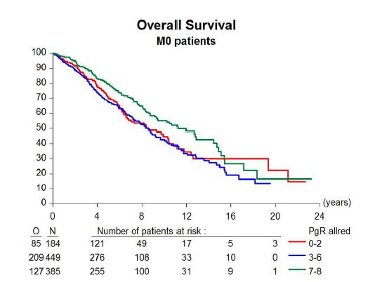 根据患者PR是否表达和表达强度来分析:PR阴性的患者,mRFS和mOS分别为6.9年和8.4年;PR低表达(allred评分3-6)的患者,mRFS和mOS分别为6.5年和8.4年;PR高表达(allred评分7-8)的患者,mRFS和mOS分别为8.6年和11.2年,如下图4c。