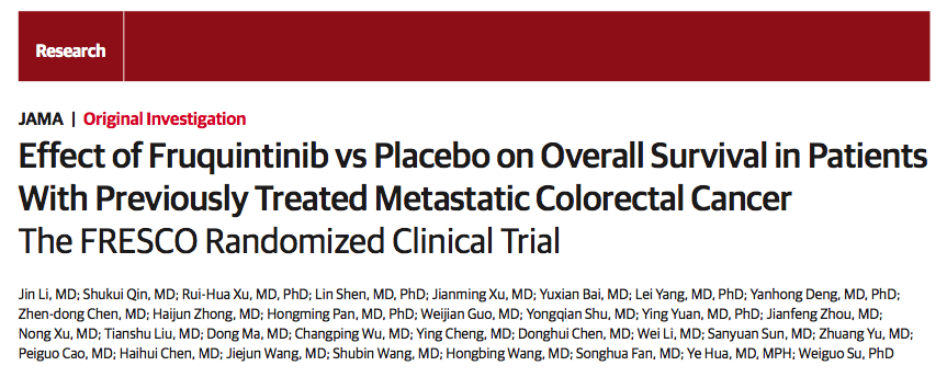 FRESCO研究证实呋喹替尼用于晚期结直肠癌三线治疗可显著降低患者的死亡风险,并展示了良好的耐受性和安全性。国际知名医学期刊JAMA《美国医学会杂志》于近日发表了呋喹替尼治疗转移性结直肠癌III期关键性临床研究FRESCO的主要研究结果,【肿瘤资讯】特邀研究PI秦叔逵教授分享研究成功的经验。