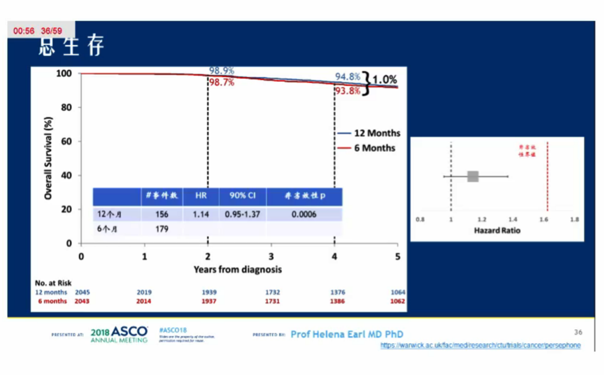 来自于英国152个地区的4089例患者随机分组(2007年10月~2015年7月),1例患者重复随机,分析集共4088例患者。总体人群中,ER+的患者69%;基于蒽环类药物(A)化疗的患者占41%,基于A+紫杉烷(T)的患者49%,基于T方案的患者10%。2018年4月数据更新并重新进行分析,中位随访时间5.4年时,335例(8%)患者死亡,512例(13%)患者复发或死亡。两组的DFS对比, 4年DFS分别为89.8% vs 89.4%, HR为1.07(95% CI,0.93~1.24;P=0.01),证实6个月曲妥珠单抗的非劣效性。预设的亚组分析显示,ER-,接受紫衫类+/-蒽环类,接受新辅助化疗,化疗与曲妥珠单抗同步治疗的患者接受12个月的曲妥珠单抗辅助治疗可能更优。总生存率结果一致,两组的4年OS率分别94.8% vs 93.8%,HR为1.14(90%CI:0.95-1.37,P=0.0006)。毒性分析显示,20%的患者在接受曲妥珠单抗治疗中出现3-4级毒性(6个月组和12个月组的发生率分别为23%和18%,P =0.001)。