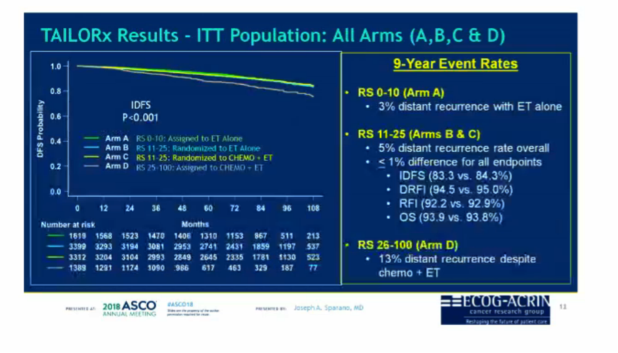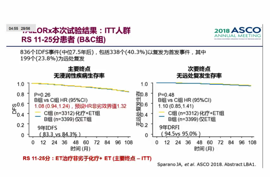 小结:TAILORx研究的主要结果证实,对于在HR+/HER2-,腋窝淋巴结阴性且RS 11-25分的患者,内分泌治疗不劣与化疗+内分泌治疗。RS 0-10分的患者,接受单纯内分泌治疗的远处复发率非常低,9年远处复发率为2-3%。RS 25-100分的患者,即使接受了辅助化疗+内分泌治疗,已有很高的复发率。