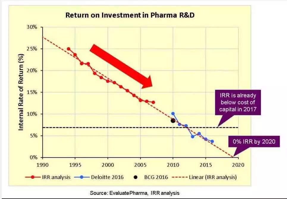 德勤在2017年上半年发布的《新药研发的新前景,如何衡量2017年医药创新回报》(A New Future For R&D? Measuring the Return From Pharmaceutical Innovation 2017)报告,德勤对全球12家大型制药企业的持续追踪结果显示,制药巨头们的药物研发投资回报率已从2010年的10.1%下降至2017年的3.2%。与此同时,这些大型药企将一种新药推向市场的平均成本已经从2010年的11.88亿美元(约合79亿元)飙升到了2017年的19.92亿美元(约合132亿元),而且推出一款新药平均需耗时14年。