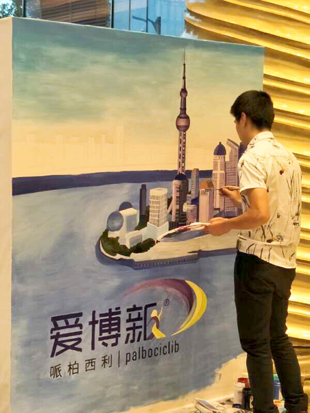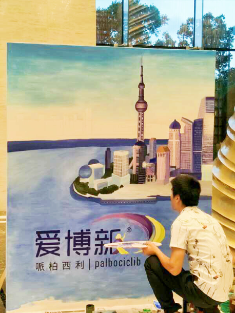 同在厦门,另一画家手持画盘,正在一幅瑰丽的东方明珠之前精修细作,左下角“爱博新”栩栩如生,立于眼前。不同风格的画作,让我们从阴沉笼郁下双子塔的黯然,转移到碧瓦蓝天下国际都市之景,崭新的力量油然而生。
