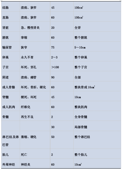 6.危及器官的耐受剂量:宫颈癌放射治疗的危及器官包括膀胱、直肠、结肠、骨髓、皮肤、小肠、输尿管等,一般用TD5/5表示最小放射耐受量,表示在治疗后5年内,严重并发症发生率不超过5%,表5为各个危险器官的TD5/5。