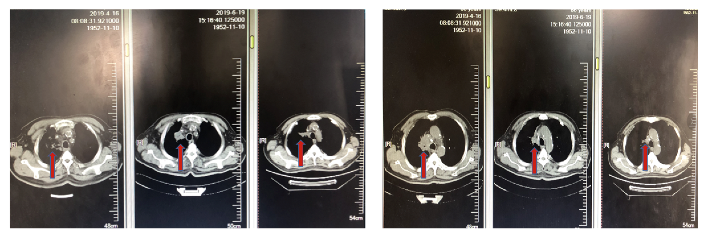 2019年5月更换为GP方案化疗,具体方案为吉西他滨1400mg + 顺铂 100mg x 1周期。同时接受唑来膦酸4mg x 1周期。化疗期间患者咳血胸闷加重,且周身乏力不适症状明显,急诊入院。1周期化疗后咳嗽咳血加重,腰部疼痛未缓解。复查胸部CT,右肺上叶病灶PD;右肾上腺病灶SD。患者对治疗耐受差,总体评价为PD。