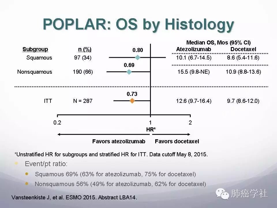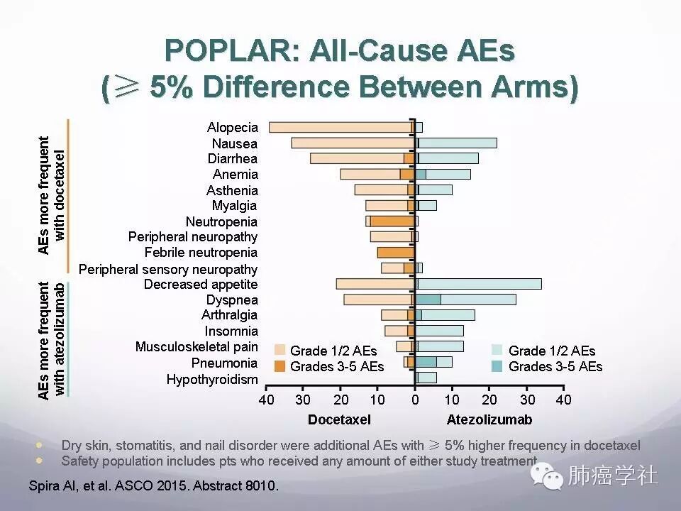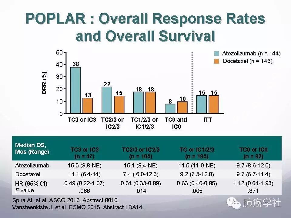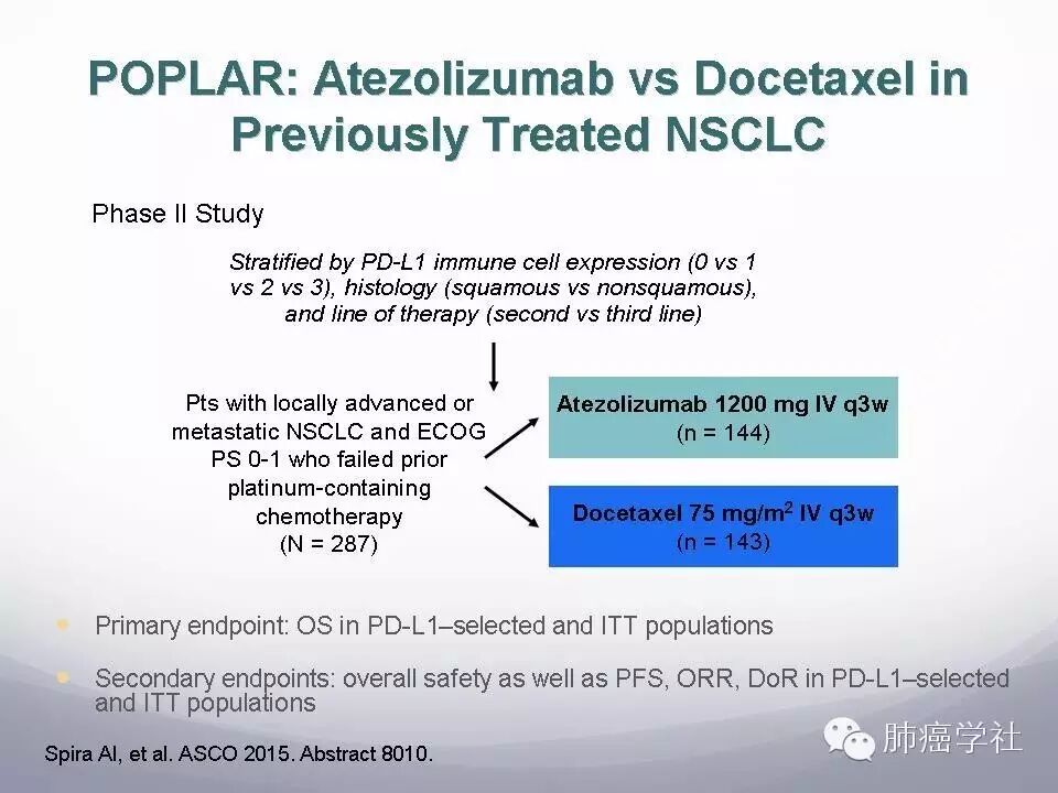 1.  POPLAR是第一个PD-L1监测点抑制剂Atezolizumab对比多西他赛治疗经治的晚期NSCLC的随机临床研究,Atezolizumab与多西他赛单药相比明显提高患者生存时间。