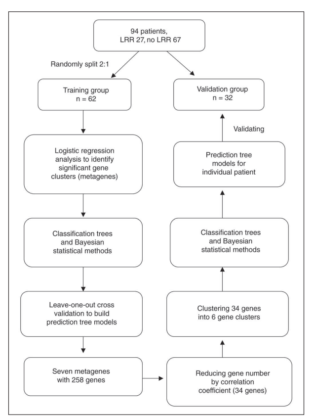2006年,研究者Cheng等利用94例未做PMRT患者的样本(27 LRR,67 non LRR),对基因模型进一步优化(图4),首先筛选出258基因组(图5),再进一步筛选出最相关的34基因组,可区分出高风险和低风险组(表2)。低风险组的3年局部区域复发(LRR)控制率91%;高风险组的LRR控制率低于40%,检测准确度为75% ~ 78%(图6)。