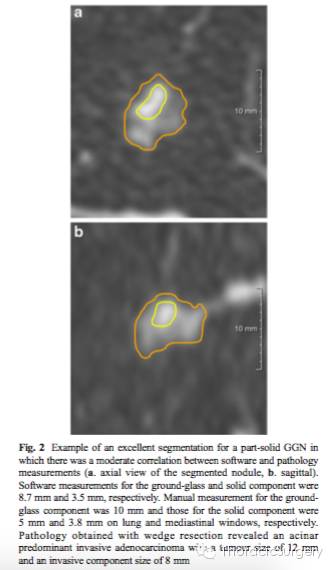 所以,研究者认为对于亚实性肺腺癌,计算机软件测量毛玻璃影和实性成份可与病理测量相媲美。计算机软件能有效地分割亚实性结节的毛玻璃影和实性成份。同时,对于实性成份常规的影像学测量手段肺窗比纵隔窗更为准确。当然,研究者指出,该测量方案对于浸润前病变和病灶中有血管穿过的患者并不准确,且对于病理浸润成份大雨10mm的病灶也不够精确。