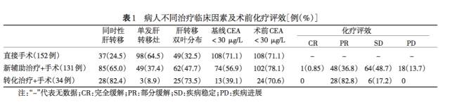 对可切除的结直肠癌肝转移病人术前是否考虑新辅助治疗,包括全身化疗联合或不联合靶向药物等,目前还存在争议。40983 研究(EPOC)显示对于可切除肝转移病人给予新辅助化疗(FOLFOX4)可提高无疾病进展生存期(PFS),对总生存期(OS)虽有改善,但差异无统计学意义[16]。Sorbye 等[17]对40983 的研究结果进行了细致的分析,在40983 研究中接近半数的病人为原发灶N0 的病人,半数病人肝转移为单发,而CEA<30 μg/L 的病人更是达到了70%。因此,其入组病人主要是病情较早的肝转移病人,本身术后复发率就偏低,相比手术带来的巨大获益,新辅助化疗的获益就更不明显。法国Adam 等[18]的研究也印证了这个观点,在单发、异时性的低危肝转移中,进行新辅助治疗并不能获益。在本研究中,直接手术病人单发病灶占64.5% ,CEA<30 μg/L 占71.1% ,而同时性肝转移仅占24.5%。而在新辅助治疗+手术病人,单发病灶仅占37.4%,CEA<30 μg/L 在化疗前仅占56.9%,而同时性肝转移则高达65%,属于术后高危复发、不良预后病人,但最终生存分析显示新辅助治疗+手术病人术后生存与直接手术者类似,中位生存期45 个月vs. 37 个月,3 年存活率分别为62.8% vs. 50.3%(P>0.05)。其原因通过进一步分析可以看到,完成新辅助治疗后CEA<30 μg/L 所占比例由56.9%升至78.1%,化疗方案控制率(CR+PR+SD)占86.3%(表1)。这从另一个方面支持了对于初始可切除的肝转移病人,新辅助治疗可以帮助高危组病人达到与低危组近似的术后生存时间。对于新辅助化疗敏感的病人,甚至看到了优于直接手术的趋势。