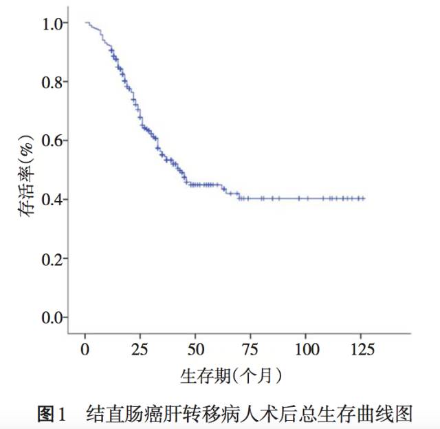 结直肠癌肝转移病人接受根治性手术切除后总体中位生存期为43个月,5 年存活率45.0%(见图1),无病中位生存期11 个月,5 年无病存活率24.8%。