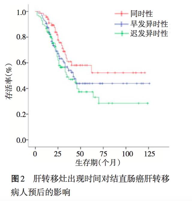 同时性肝转移病人中位生存期为35 个月,5 年存活率33.2%,早发异时性肝转移病人中位生存期为42 个月,5 年存活率43.9%。迟发异时性肝转移病人中位生存期为63 个月,5 年存活率58.1%。三组差异有统计学意义(P<0.05)(见图2)。