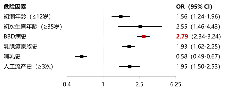 众所周知,乳腺癌已成为严重威胁我国女性健康的恶性肿瘤之一,根据国家癌症中心最新数据,2015年中国乳腺癌新增发病数30.4万例,死亡7万例1。面对如此高的发病率及死亡率,“防乳腺癌于未然”已成为广大女性同胞和临床医生关注的重中之重。国内外学者通过数十年的观察研究认识到,乳腺良性病变(breast benign diseases,BBD)与乳腺癌的发生存在一定的相关性,既往有BBD的女性人群患乳腺癌的风险增高。同样,对于中国女性而言,相比乳腺癌家族史、初次生育年龄≥35岁、人工流产≥3次,BBD病史大大增加了乳腺癌风险(图1),且45~60岁的5年预期发病风险最高2。因此,探秘BBD对乳腺癌风险预测有着不可忽视的作用。