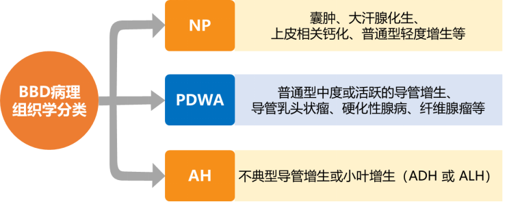 BBD从病理组织学上分为三大类:非增生性病变(NP)、无不典型增生的增生性病变(PDWA)、不典型增生(AH)(图2),这三类病变在经活检的BBD中估计发病率分别为66%、30%和4%。