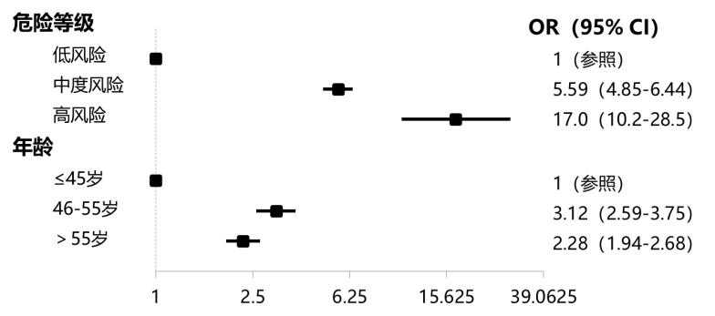 图1 中国女性乳腺癌6个主要危险因素的风险比