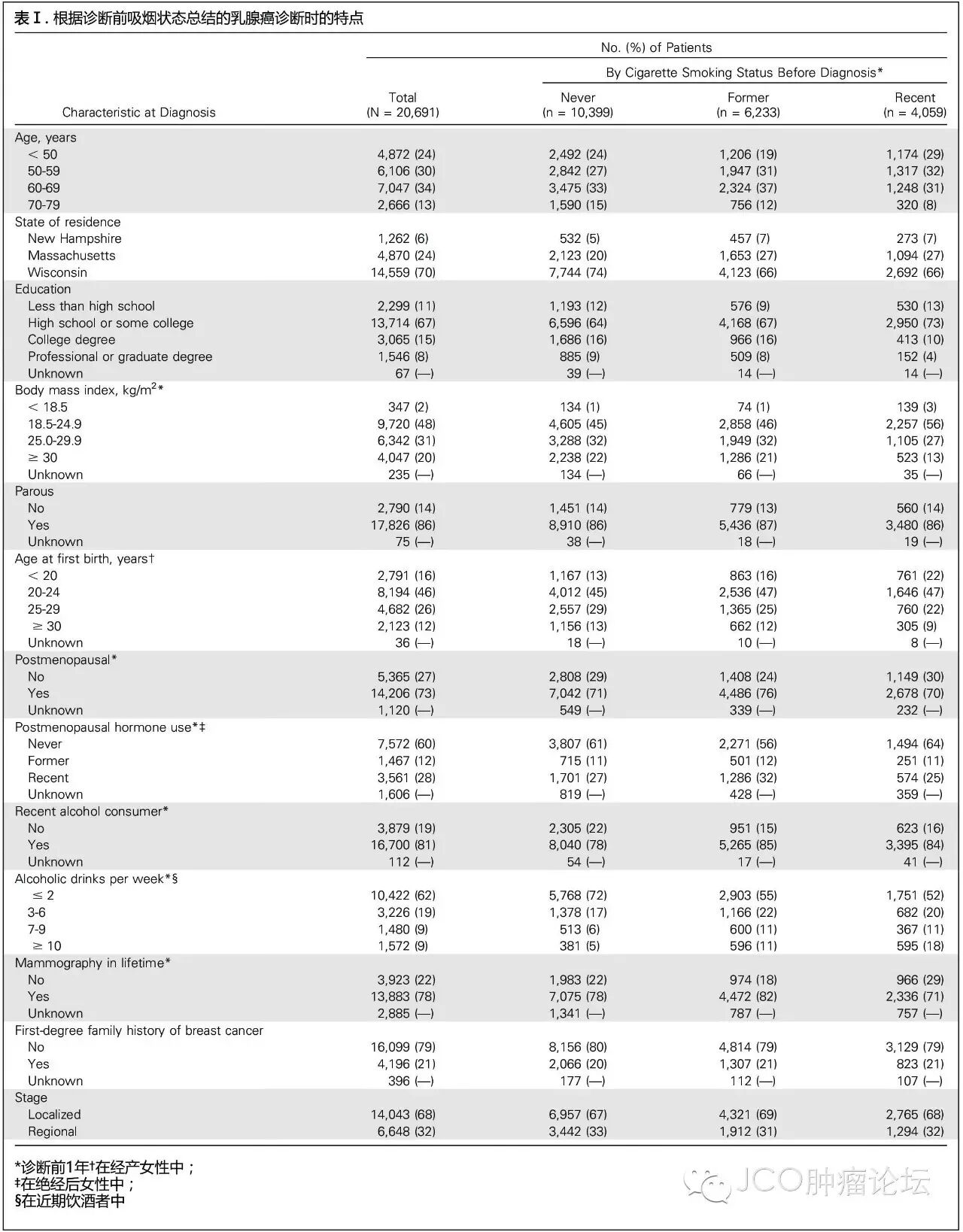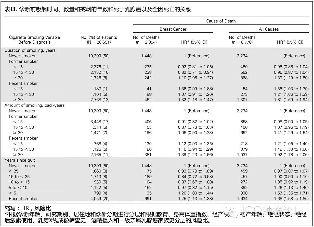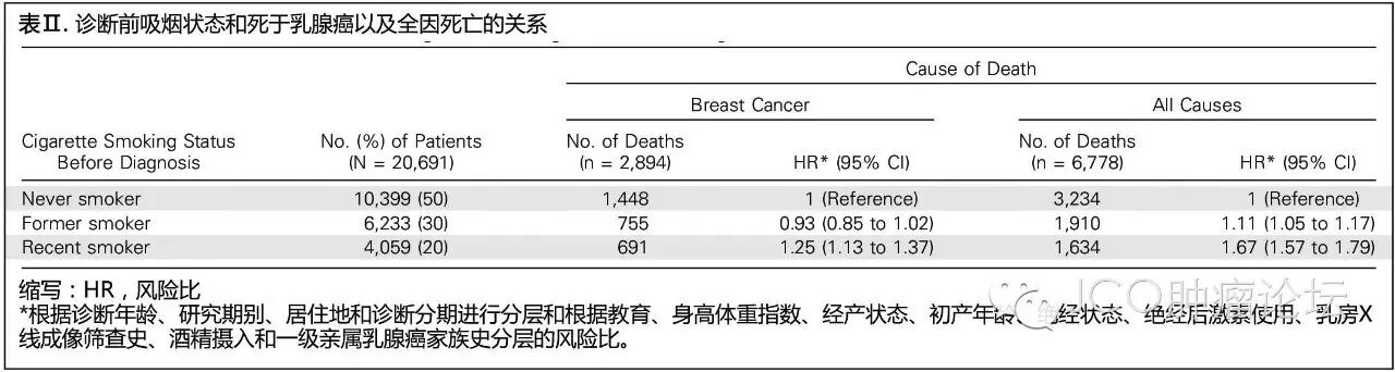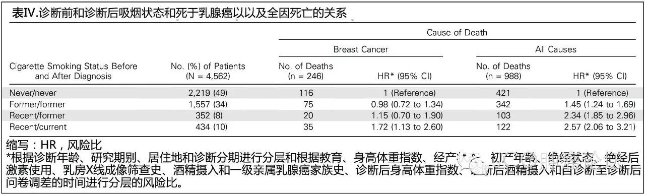 结论:乳腺癌诊断前后的吸烟状态与乳腺癌及其他原因所致的死亡率增高相关。
