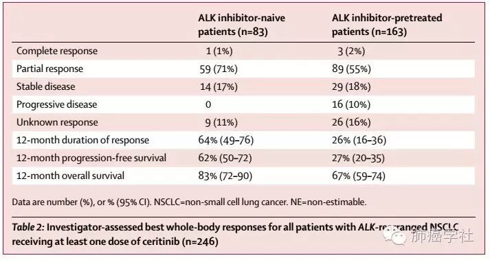 83名未经ALK-抑制剂治疗的患者中,60名获得了客观缓解,ORR是72% (95%CI:61–82),163名已经接受过ALK-抑制剂治疗的患者中,92名获得了客观缓解,ORR=56%(95%CI:49–64)。未经ALK抑制剂治疗组的中位反应持续时间为17个月(95%CI:11.3–不可估计 [NE]),ALK抑制剂经治组为8.3个月(95%CI:6.8–9.7)。 未经ALK抑制剂治疗组的中位PFS为18.4个月 (95%CI:11∙1–NE),ALK抑制剂经治疗组为6.9个月(95%CI:5.6-8.7)。94名经回顾性明确为脑转移且做过至少一次基线MRI/CT评估的患者中,未经ALK治疗的患者19人,其中颅内病灶得到控制的患者15例,占79%(95%CI:54–94),ALK抑制剂经治疗患者75人,颅内病灶得到控制的患者49例,占65%(95%CI:54–76)。94名患者中有11名患者有可测量脑部病灶且未接受过脑部放疗,其中6名达到了颅内PR。246名患者中的117名(48%)出现了严重不良事件。最常见的3-4级实验室结果异常事件为丙氨酸转氨酶升高(73例 [30%])以及天冬氨酸转氨酶升高(25例 [10%])。 最常见的3-4级非检验性不良事件为腹泻及恶心,各发生于15例(6%)患者。研究中的2例治疗期间死亡事件被研究者认定为与研究药物有关,1例死于间质性肺炎,1例死于缺血性肝炎及感染导致的器官衰竭。