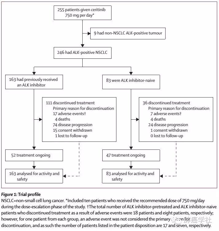 首要终点即明确最大耐受量,之前已经预先报道过。此次的更新分析包含了所有在剂量递增和扩展阶段接受推荐剂量750mg/d色瑞替尼的ALK重排的患者。在此我们报告了所有接受过至少一次750mg剂量色瑞替尼患者的OR、缓解时间、以及PFS的二次结果。探索性分析包括独立的神经放射学家对于脑转移灶在基线时未治或接受过局部治疗且为稳定状态的患者的回顾性分析。我们评估了至少接受过一次色瑞替尼治疗的所有患者用药的安全性。现本试验停止入组,治疗与随访正在进行中,本次研究已于ClinicalTrials.gov注册,注册号为NCT01283516。