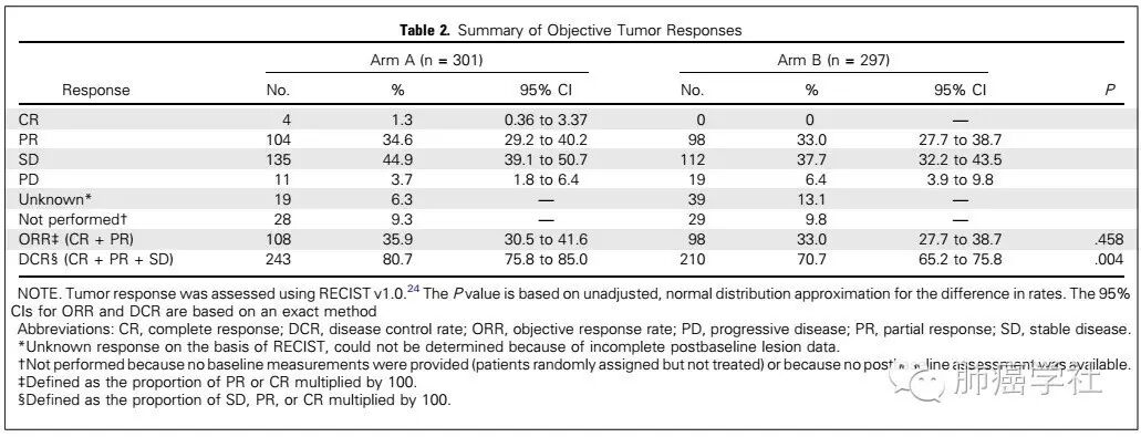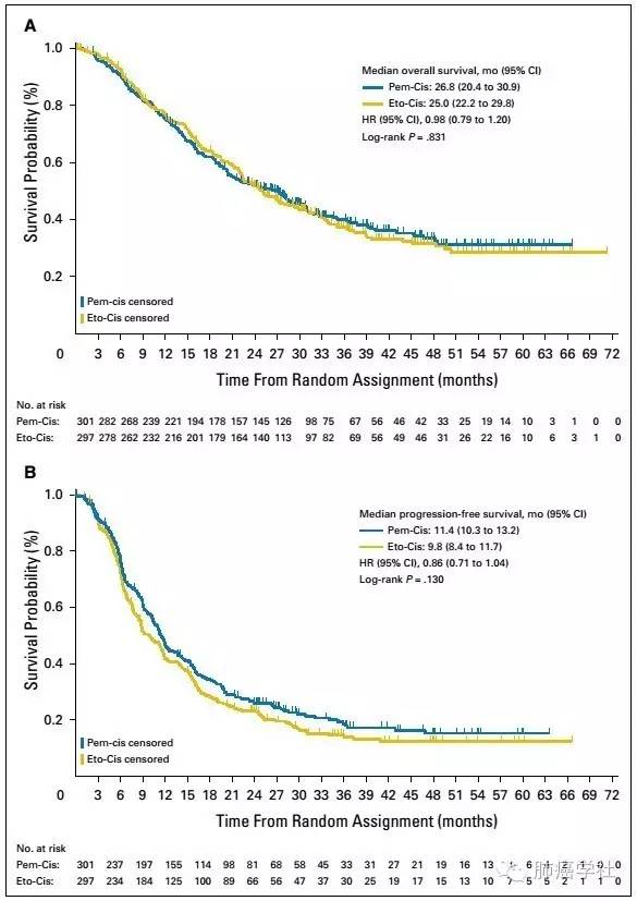 由于中期分析时数据表现出的无效性入组提前终止。598名患者被随机分组(A组301人,B组297人),其中555名患者(A组283人,B组272人)接受了治疗。A组的OS并不优效于B组(HR,0.98;95% CI,0.79至1.20;中位OS,26.8个月vs 25.0个月;P=0.831)。整个治疗经过中,A组所有的3-4级药物相关性不良反应发生率均显著低于B组(64.0%vs 76.8%;P=0.001),包括中性粒细胞减低(24.4% vs 44.5%;P=0.001)。