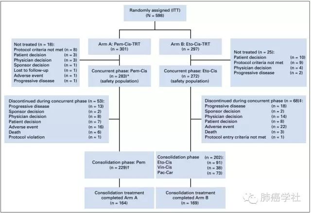IIIA/IIIB期不可切除的非鳞非小细胞肺癌患者1:1随机接受培美曲塞500mg/㎡+顺铂75mg/㎡ Q21d 静脉注射3个周期,同步TRT(60-66Gy),序贯培美曲塞单药巩固化疗4个周期(A组);或是依托泊苷50mg/㎡+顺铂50mg/㎡ Q28d 静脉注射2个周期,同步TRT(60-66Gy),序贯含铂双药化疗2个周期(B组)。首要终点为OS。此研究为优效性试验,以80%的效力检测的OS风险比为0.74,其1类错误为0.05。