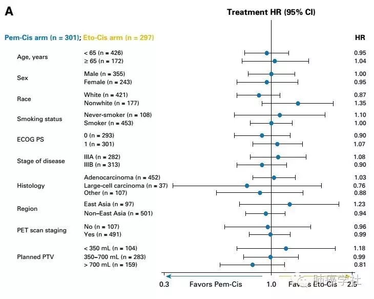 2 亚组分析中发现,IIIB期和PTV(计划靶区)大于700mL的亚组,接受培美曲塞/顺铂同步TRT后培美曲塞巩固治疗后的生存有获益趋势,提示肿瘤负荷大小可能也会影响治疗的疗效。