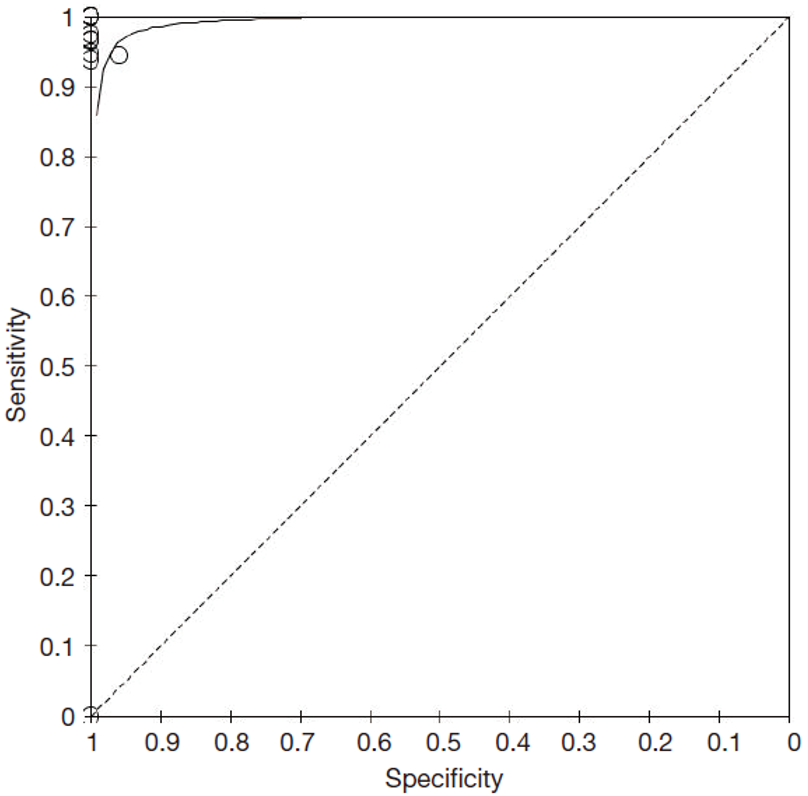 如下图所示,VABB诊断乳腺癌的灵敏度范围为0.94-1.00(平均值0.981;95% CI:0.972-0.987)。此外,特异性为0.87-1.00(平均值 0.999;95% CI:0.997-0.999)。