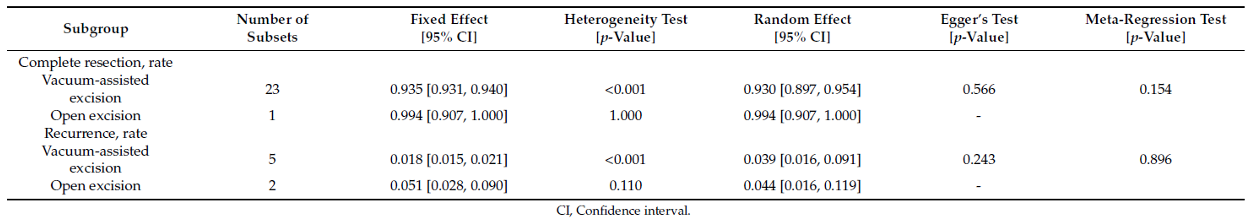 荟萃分析显示VAE完全切除率为0.930(95% CI:0.897-0.954;p<0.001),VAE组的复发率为0.039(95% CI:0.016-0.091;p<0.001)(表1)。
