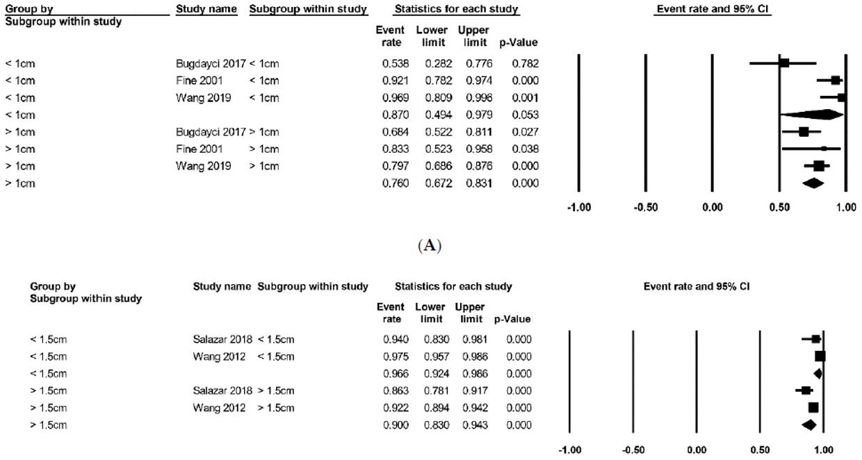 根据肿瘤大小进行亚组分析,3项研究包括按肿瘤大小1.0 cm划分的亚组(图3A)。肿瘤大小<1.0 cm的亚组的估计完全切除率为0.870(95% CI:0.494-0.979;p=0.002),而肿瘤大小>1.0 cm的亚组的估计完全切除率为0.760(95% CI:0.672-0.831;p=0.359)。2项研究包括按1.5 cm肿瘤大小划分的亚组(图3B)。肿瘤大小<1.5 cm的亚组的估计完全切除率为0.966(95% CI:0.924-0.986;p=0.163),而肿瘤大小>1.5 cm的亚组的估计完全切除率为0.900(95% CI:0.830-0.943;p=0.060)。