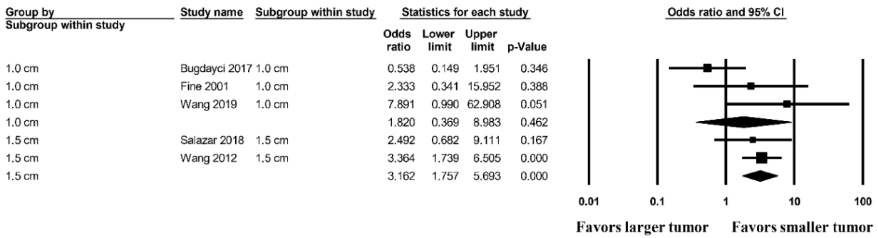 图4显示了根据肿瘤大小进行完全切除的优势比(OR)。相比>1.5 cm的肿瘤,较小的肿瘤(<1.5 cm)完全切除率显著更高(OR,3.162;95% CI:1.757-5.693;p<0.001)。然而,在肿瘤大小为1.0 cm的标准中,较大和较小肿瘤之间没有显著差异(OR,1.829;95% CI:0.369-8.983;p=0.462)。