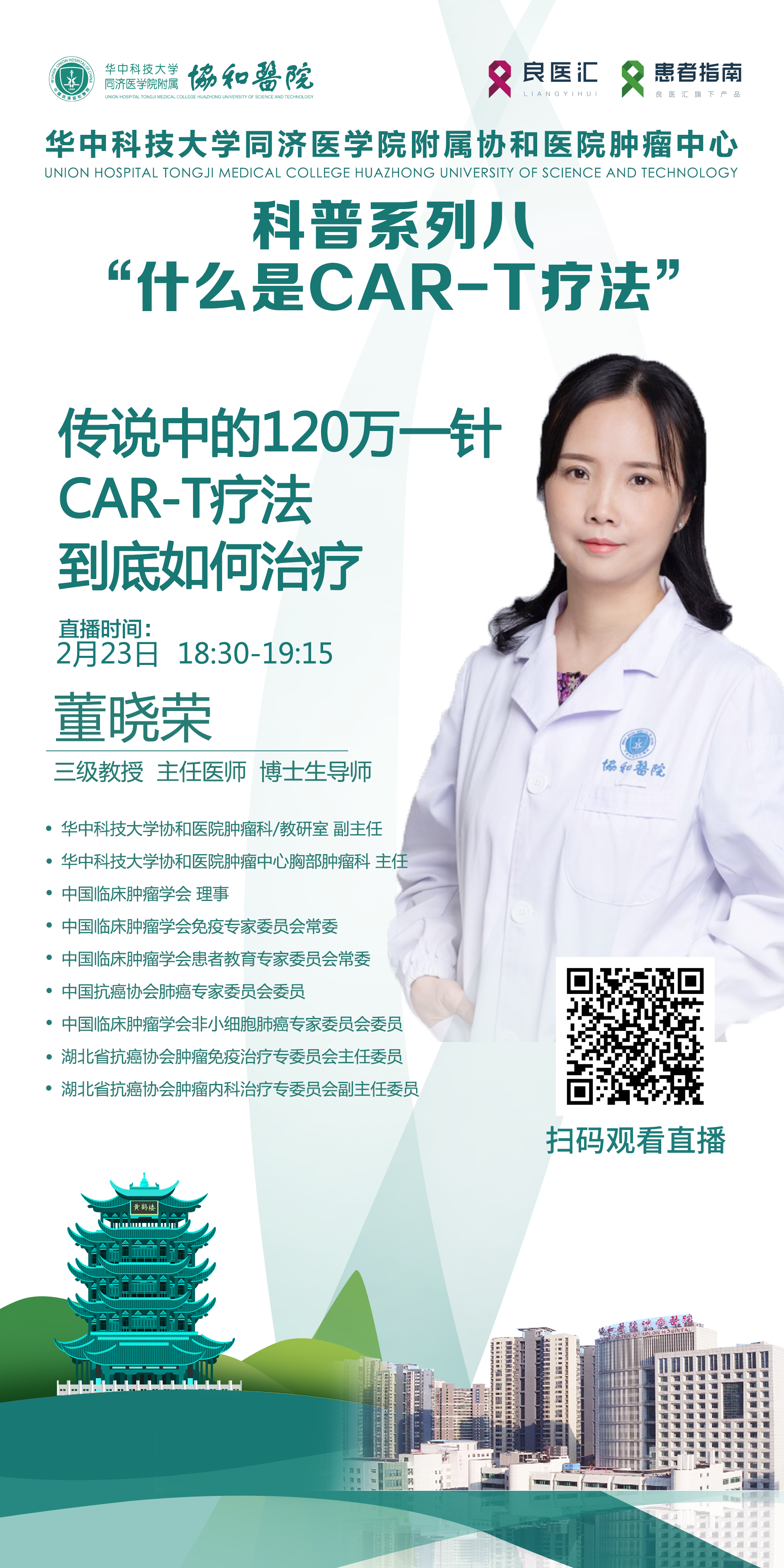 在全球范围内,肿瘤的发病率、死亡率都呈上升趋势。恶性肿瘤已成为危害人类健康的重要杀手。为了更好地让大家认识肿瘤疾病本身,让肿瘤患者获得更加规范的指导。 华中科技大学同济医学院附属协和医院联合良医汇患者服务中心举办大型在线科普义诊活动。2022年2月23日,董晓荣教授为大家带来《传说中的120万一针CAR-T疗法到底如何治疗》的科普直播讲课,欢迎大家扫码观看.