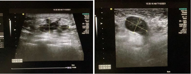 乳腺彩超示(2021-07-13,图1):右乳房7:00距离乳头约3cm,距离皮肤约1.4cm探及低回声团块,大小约3.7*1.8*1.8cm,形态不规则,内示多枚强回声,纵横比<1,内示血流信号,超声弹性成像质地偏硬(4分)。右侧腋窝多发低回声结节,最大约2.5*1.7cm,内示血流信号。