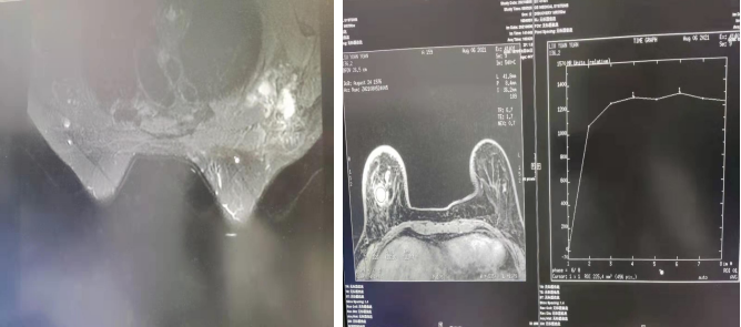 乳腺MR(2021-08-06,图3):右乳下象限见多发结节、肿块影,呈集簇状分布,T2WI呈高信号,较大病灶大小约19*32*13mm,形态不规则,边缘可见分叶,内部强化不均匀,时间-信号强度曲线平台型,DWI呈高信号,ADC值为0.865-0.932*10-3mm2/s。右侧腋窝多发增大淋巴结,最大者短径约21mm;胸骨右旁示稍大淋巴结,短径约5mm,DWI呈高信号。